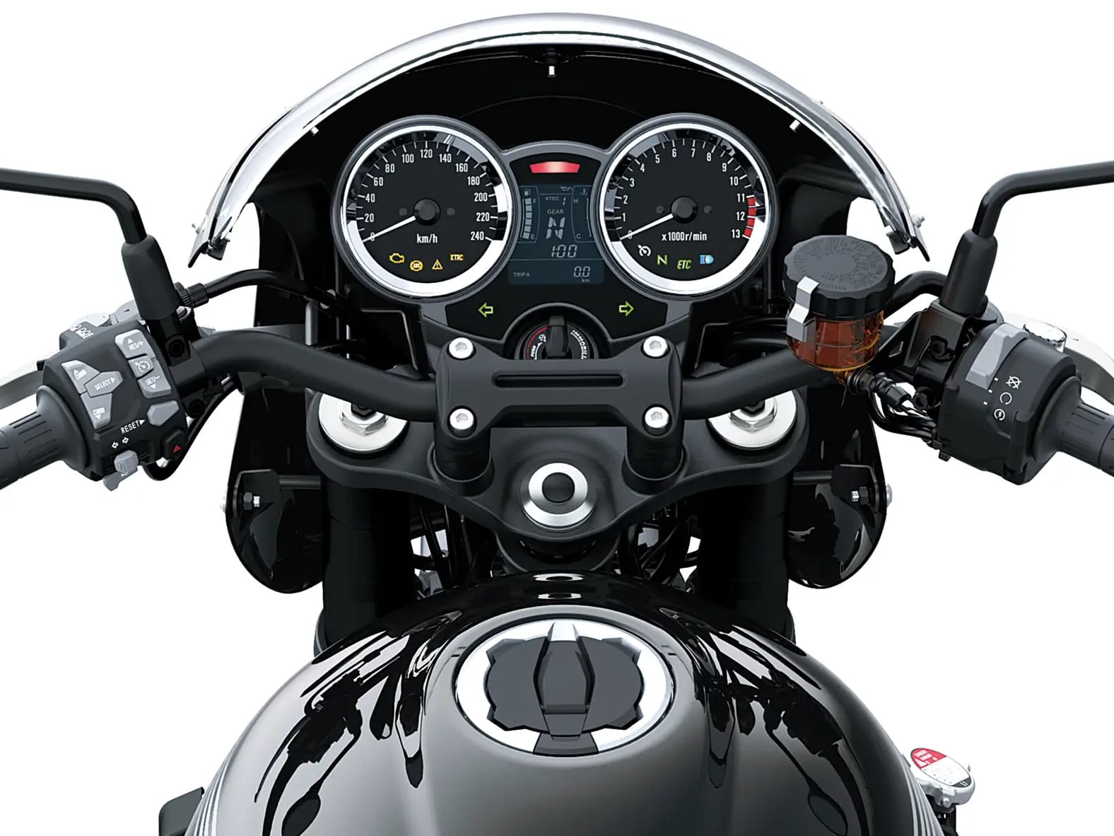 | Instruments | – Analogue speedometer and tachometer, LCD display with odometer, gear indicator, fuel gauge, dual trip meters, ambient and engine temperature, average and current consumption, range, clock |